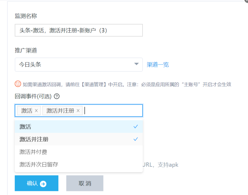 在建监测计划的时候可以自行选择转化目标,根据自己的推广需求选择相应的推广目标,激活、注册、留存、付费等。如电商类的可能会选择付费情况,那回传时间就可以选择激活并付费。