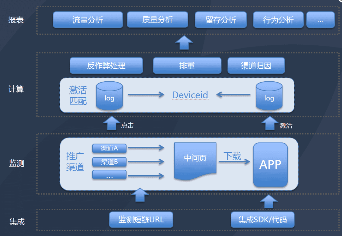 第三方监测的原理是通过SDK的方式,把监测代码嵌入我们APP内,通过建不同渠道的监测计划生成监测链接,然后用生成的监测链接跟对应的推广平台进行联调,联调成功后,就可以监测这个渠道的投放数据,当不同渠道的广告用户点击广告安装激活注册APP之后,会回传给第三方的监测平台,由此计入一次转化。