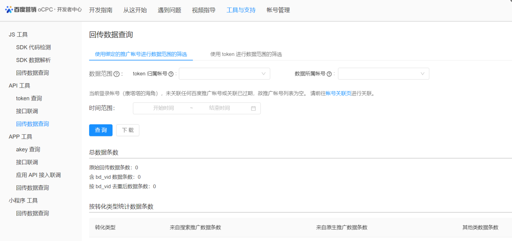 ③ 授权完成后,技术同学即可使用百度账号登录开发者中心,选择"工具与支持"->"API工具"->"回传数据查询",进行数据核对。
