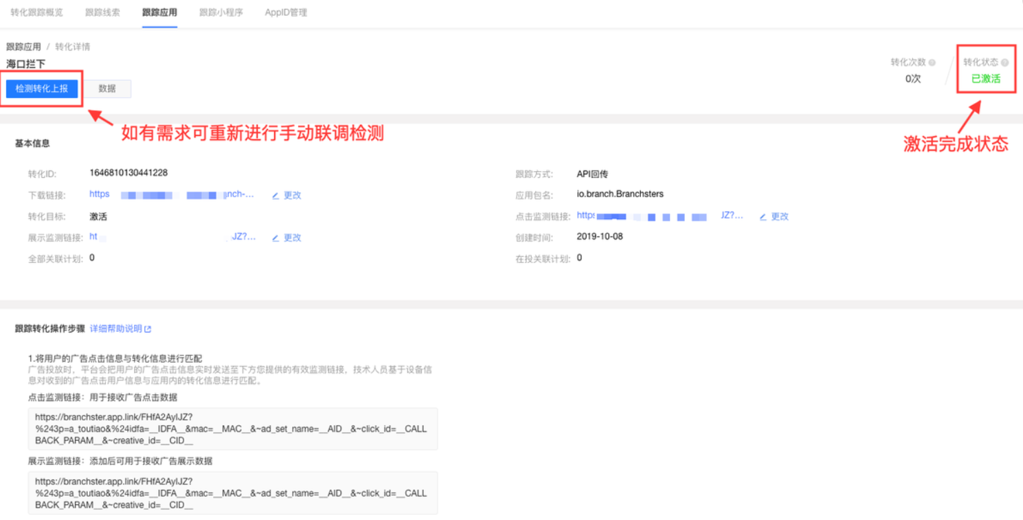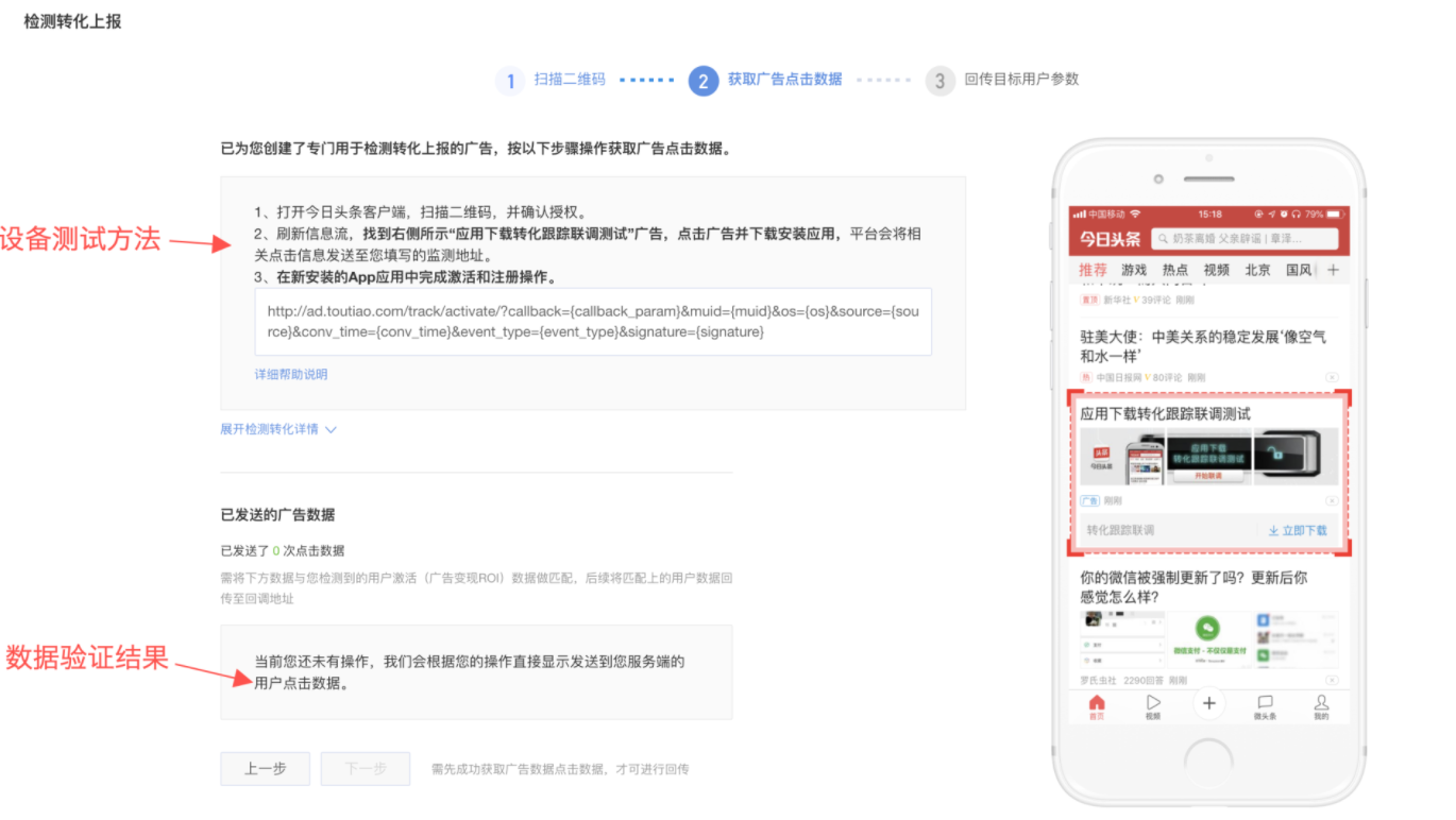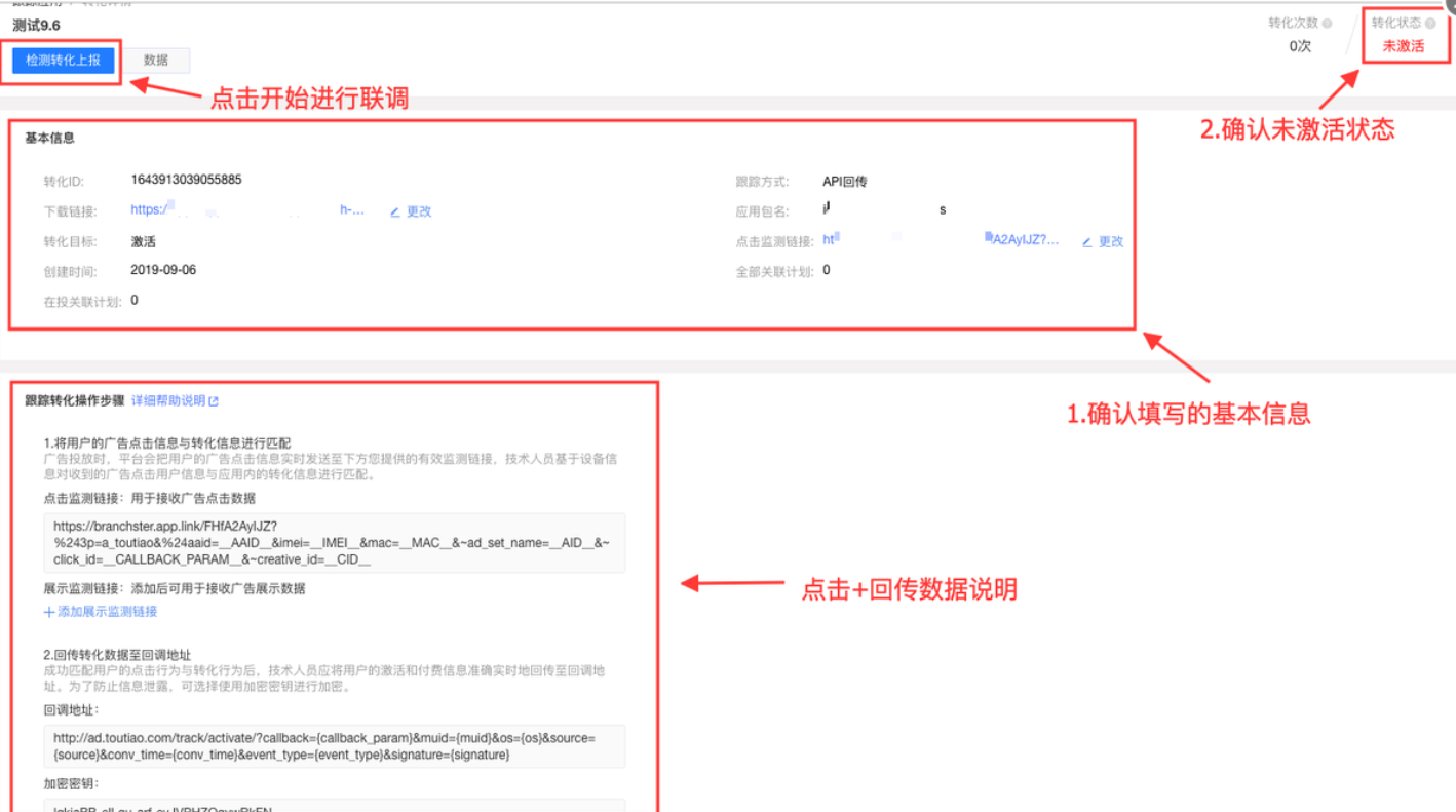 友盟后台创建好监测计划后,与推广后台进行联调,联调目的在于确保您正确调用了回传地址,能够将转化用户进行回传,以巨量后台为例: