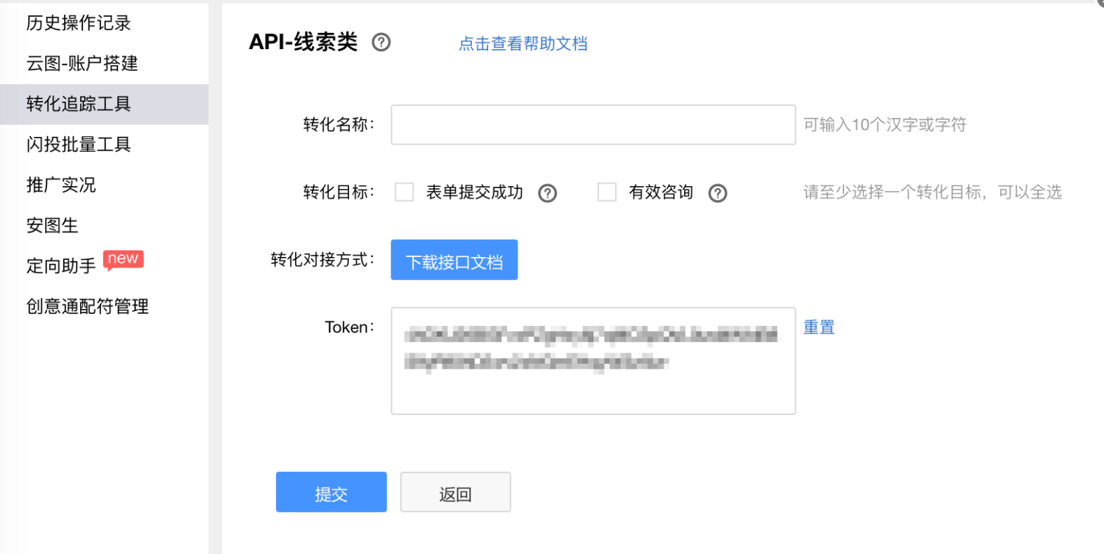 登录信息流推广后台,确认转化类型后新建API类型转化追踪,并得到API接口Token。每个账户都有唯一的token
