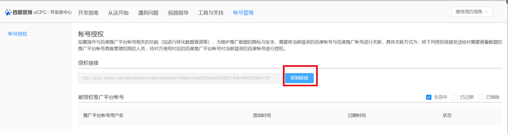 ① 技术同学使用百度账号登录开发者中心,点击"帐号管理",点击"复制链接"。页面如下: