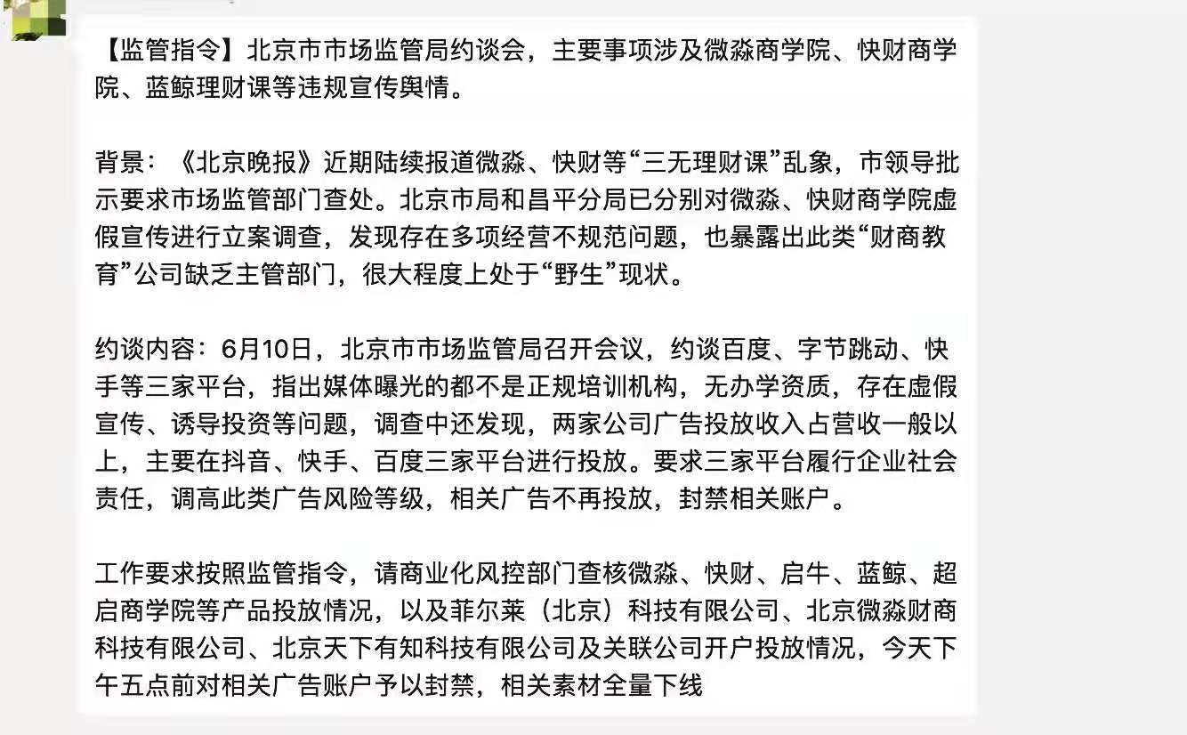 北京市市场监管局约谈会,主要事项涉及微淼商学院、快财商学院、蓝鲸理财课等违规宣传舆情。