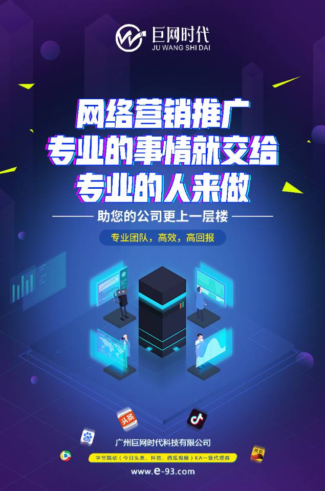 广州巨网时代科技有限公司简称“巨网时代”是一家面向各大企业的综合性网络营销服务公司,为企业提供专业的互联网综合解决方案,用数据与效果说话。成为中国主流媒体字节跳动(抖音、今日头条、西瓜视频)一级代理商;巨网时代全新营销释放全新解决方案效能。用科学思维探索营销规律,让营销可量化、可诊断、可提效,为生意实现可持续增长。巨网时代汇聚行业专业资深的技术运营团队、短视频拍摄团队,生动、有趣、有料地解决客户营销难题。