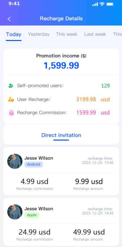 3、后台可开裂变下级团队拿团队收益,满足你多级渠道的使用场景;